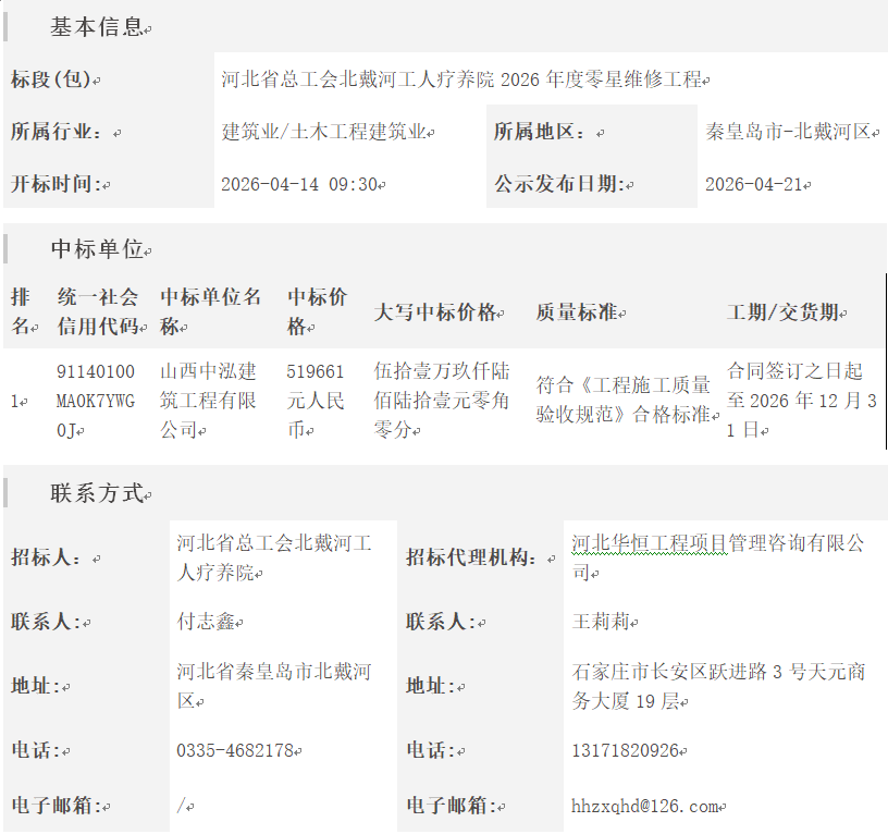 河北省总工会北戴河工人疗养院2026年度零星维修工程 中标公告